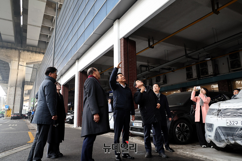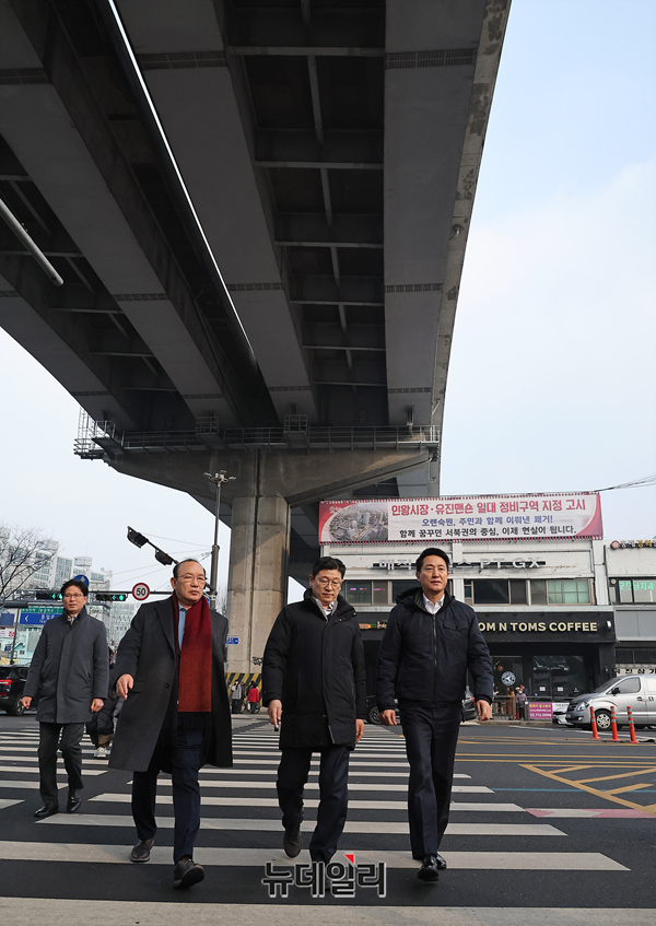 오세훈 서울시장이 15일 오후 서울 서대문구 홍제천 일대 내부순환로 현장을 찾아 현장을 둘러보고 있다. 오 시장은 지난해 내부순환로와 북부간선도로를 지하화하는 '강북횡단 지하도시고속도로 건설사업'을 추진한다고 밝혔다.