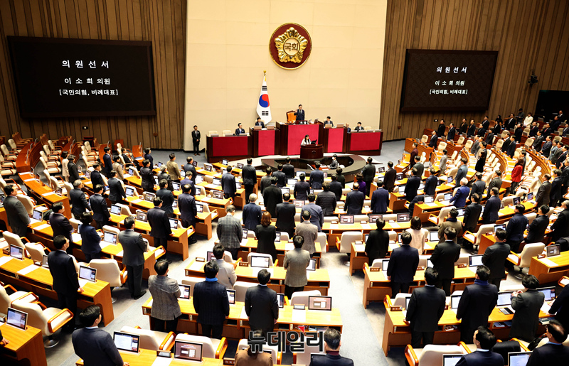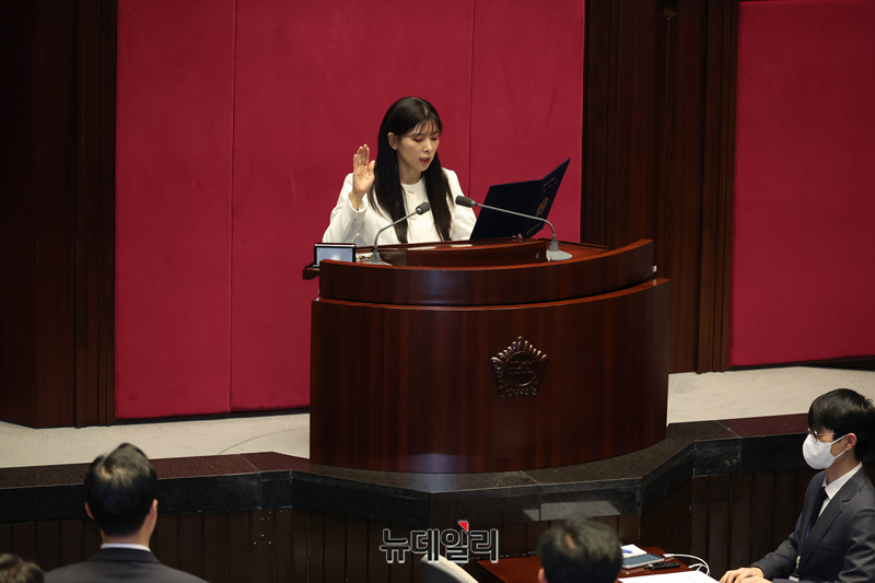 인요한 전 의원의 사퇴로 비례 의석을 승계한 이소희 국민의힘 의원이 15일 국회 본회의장에서 열린 본회의에서 선서를 하고 있다.