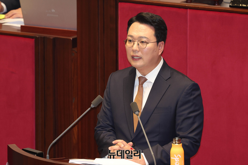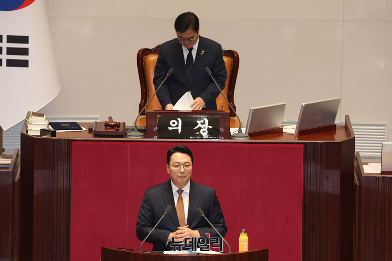 천하람 개혁신당 원내대표가 15일 오후 국회에서 열린 본회의에서 '윤석열ㆍ김건희에 의한 내란ㆍ외환 및 국정농단 행위의 진상 규명을 위한 특별검사 임명 등에 관한 법률안'에 대한 무제한토론을 하고 있다.