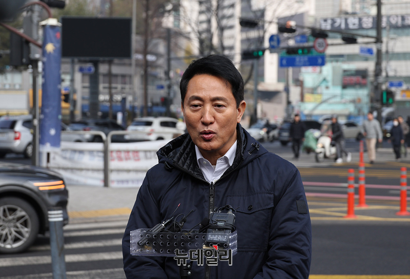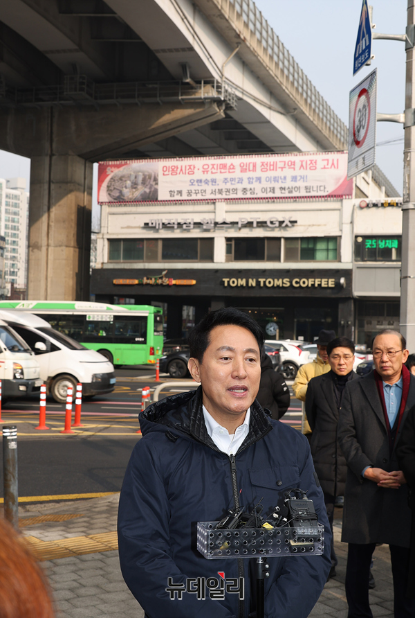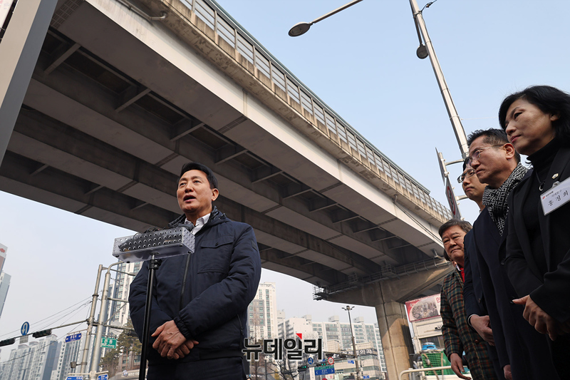 오세훈 서울시장이 15일 오후 서울 서대문구 홍제천 일대 내부순환로 현장을 찾아 강북횡단 지하도시고속도로 관려 메시지를 발표하고 있다. 오 시장은 지난해 내부순환로와 북부간선도로를 지하화하는 '강북횡단 지하도시고속도로 건설사업'을 추진한다고 밝혔다.
