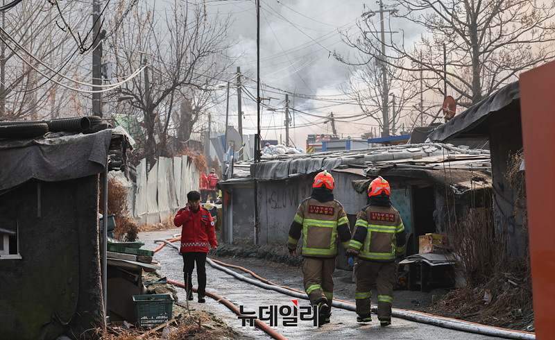 서울 강남구 구룡마을에서 화재가 발생한 가운데 16일 오전 화재현장에서 소방당국 관계자들이 현장을 정리하고 있다.