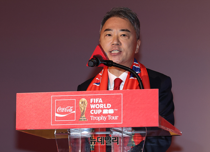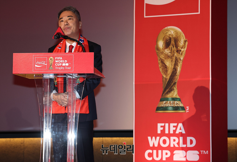 이준엽 한국 코카-콜라 대표가 16일 오후 서울 CGV용산아이파크몰에서 FIFA 월드컵 2026™ 우승국에 수여되는 오리지널 FIFA 월드컵™ 트로피를 공개를 앞두고 인사말을 하고 있다.오리지널 피파 월드컵은 이날 오전 코카-콜라 특별전세기로 김포공항을 통해 입국했다.이날 간담회에는 전 브라질 축구 국가대표 선수 지우베르투 시우바(Gilberto Silva)를 비롯해 차범근 전 감독, 이영표 축구 해설위원, 차두리 화성FC 감독, 구자철 레드앤골드풋볼 아시아 스포츠 디렉터, 김승희 축구협회 전무, 이준엽 한국 코카-콜라 대표 등이 참석했다.코카-콜라는 17일 오전 10시 30분부터 오후 8시까지 하루 동안 CGV용산아이파크몰에서 오리지널 FIFA 월드컵 트로피를 직접 관람할 수 있는 소비자 체험 행사를 진행한다.방문객은 오리지널 FIFA 월드컵 트로피를 관람하고, 셀프 포토부스를 이용해 기념 촬영을 할 수 있으며, 특별 기념품으로 FIFA 월드컵 트로피 키링도 받을 수 있다. 행사는 캐치테이블 앱을 통해 현장 방문 접수 및 참여가 가능하다.