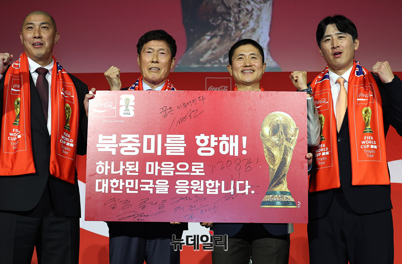 코카-콜라가 16일 오후 서울 CGV용산아이파크몰에서 FIFA 월드컵 2026™ 우승국에 수여되는 오리지널 FIFA 월드컵™ 트로피를 공개한 가운데 차두리, 차범근, 이영표, 구자철이 북중미월드컵을 앞둔 후배 선수들에게 응원의 메시지를 전하고 있다. 오리지널 피파 월드컵은 이날 오전 코카-콜라 특별전세기로 김포공항을 통해 입국했다.이날 간담회에는 전 브라질 축구 국가대표 선수 지우베르투 시우바(Gilberto Silva)를 비롯해 차범근 전 감독, 이영표 축구 해설위원, 차두리 화성FC 감독, 구자철 레드앤골드풋볼 아시아 스포츠 디렉터, 김승희 축구협회 전무, 이준엽 한국 코카-콜라 대표 등이 참석했다.코카-콜라는 17일 오전 10시 30분부터 오후 8시까지 하루 동안 CGV용산아이파크몰에서 오리지널 FIFA 월드컵 트로피를 직접 관람할 수 있는 소비자 체험 행사를 진행한다.방문객은 오리지널 FIFA 월드컵 트로피를 관람하고, 셀프 포토부스를 이용해 기념 촬영을 할 수 있으며, 특별 기념품으로 FIFA 월드컵 트로피 키링도 받을 수 있다. 행사는 캐치테이블 앱을 통해 현장 방문 접수 및 참여가 가능하다.