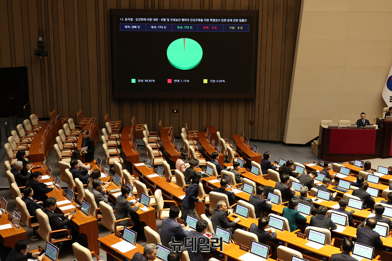 '윤석열ㆍ김건희에 의한 내란ㆍ외환 및 국정농단 행위의 진상 규명을 위한 특별검사 임명 등에 관한 법률안'이 16일 오후 국회에서 열린 본회의에서 재석 174인, 찬성 172인, 반대 2인으로 가결되고 있다.