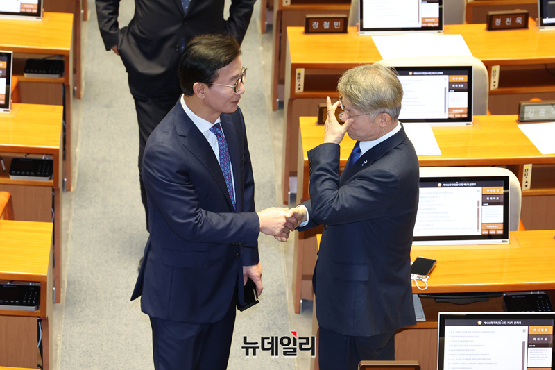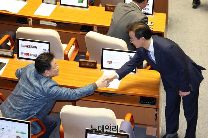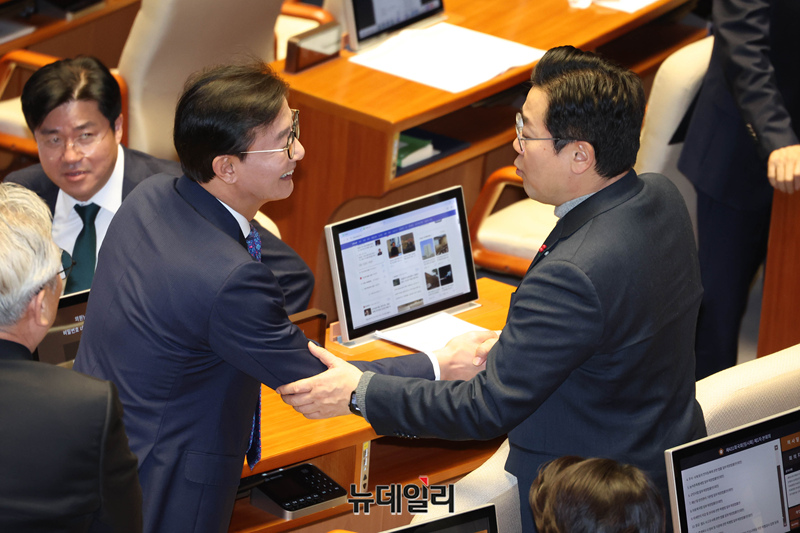 전재수 전 해양수산부 장관이 16일 오후 국회에서 열린 본회의에서 의원들과 인사를 하고 있다.