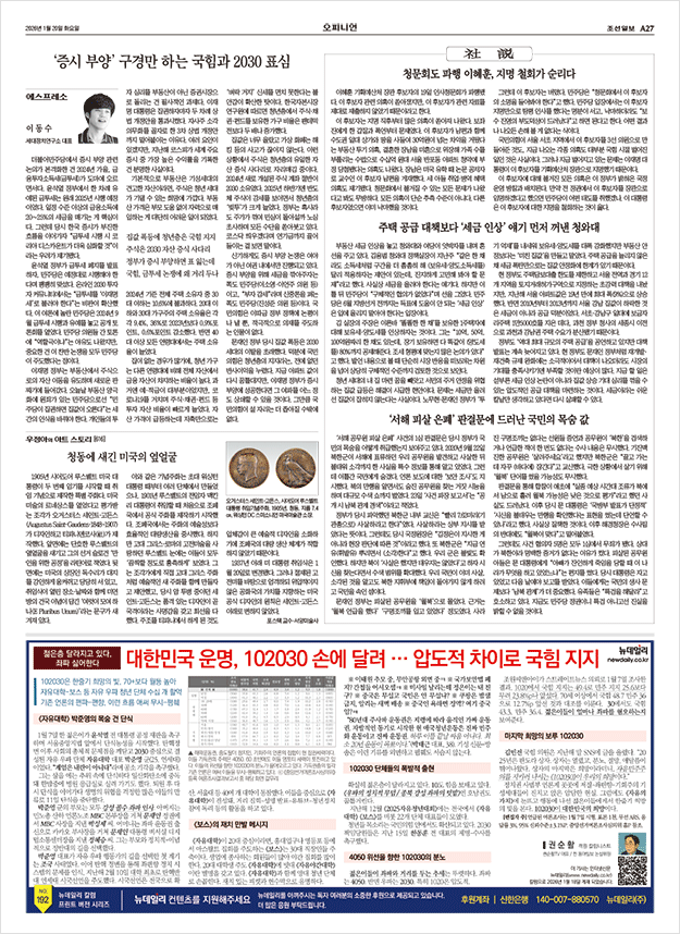 ■ 4050 영포티 위선을 향한 102030의 분노젊은이들이 좌파와 거리를 두는 추세는 연령별 여론조사 결과를 면밀히 살펴봐도 한 눈에 알 수 있다.현재 각종 여론조사에서 더불어민주당으로 대표되는 좌파정당 지지세가 가장 강한 세대는 4050세대다.반면 2030세대, 특히 10대 후반에서 20대까지는 국민의힘으로 대표되는 우파정당 지지율이 좌파정당 지지율에 비해 압도적으로 높아 눈길을 끈다.여론조사업체《조원씨앤아이》가《스트레이트뉴스》의뢰로 1월 7일 조사해 다음날인 8일 공개한 여론조사 결과에 따르면, 18세 이상 29세 이하 연령층에서 국민의힘 지지율은 49.4%로 민주당 지지율 25.6%보다 무려 23.8%포인트나 앞섰다.이는 70세 이상에서 국힘 48.7% 민주당 36.0%로 국힘이 12.7%포인트 앞선 것과 비교해도 월등히 격차가 크다.현재 젊은이들이 얼마나 좌파 정치세력을 혐오하는지를 보여준다.또 30대에서도 국힘 43.3%, 민주당 36.4%로 국힘이 민주당을 앞질렀다.반면 40대와 50대, 심지어 이제 소위 과거의 386 세대가 대거 진입한 60대에서는 민주당 지지율이 국힘 지지율을 웃돈 것으로 조사됐다.연령별 정치의식 분석에서 과거 상식으로 통하던《여의도 정치문법》이 더 이상 통하지 않는 시대가 됐다.■ 마지막 희망의 보루 102030현직 국회의원 중 각성한 청년들로부터 신뢰를 받고 있는 몇 안 되는 정치인 중 한 명인 김민전 국민의힘 의원은 2025년이 끝나가는 시점인 지난해 12월 31일 저녁 자신의 소셜미디어에 이런 글을 올렸다.“2025년은 판도라상자 같은 한해였다.상자는 열렸고, 분노, 절망, 애달픔이 튀어나왔다.상자의 마지막은 희망이라더니, 자유민주주의를 지키러 나서는《102030》이 우리의 희망이다.”정치권 사법부 언론계 등 한국 사회 곳곳에서 저질의 좌편향 기성세대나 비겁한 기회주의 웰빙 기성세대들이 또아리를 틀고 앉아 악취를 내뿜는 암담한 현실을 보면서, 한국의 미래에 대해 절망을 예감하는 이들이 한두 명이 아닐 것이다.그런 속에서도《자유의 가치》에 새로 눈뜨고 이를 지키기 위해 정의로운 행동에 나선 많은 젊은이들을 보면서 한줄기 희망의 빛을 본다.김민전 의원의 말대로 자유민주주의를 지키려고 나선《102030》이 대한민국의 희망이다. - [편집자 주] 칼럼에 언급된 여론조사는 스트레이트뉴스 의뢰로 조원씨앤이이가 지난 7일 조사, 8일 공표한 내용. 전국 표본 1천명, 무선ARS, 응답률 3%, 95% 신뢰수준에 ±3.1%P. 자세한 사항은 중앙선거여론조사심의위 홈페이지 참조.