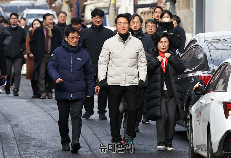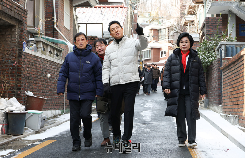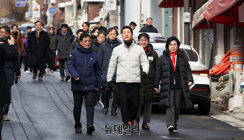 오세훈 서울시장이 19일 오전 서울 관악구 신림7구역 재개발사업 대상지에서 현장을 둘러보고 있다.