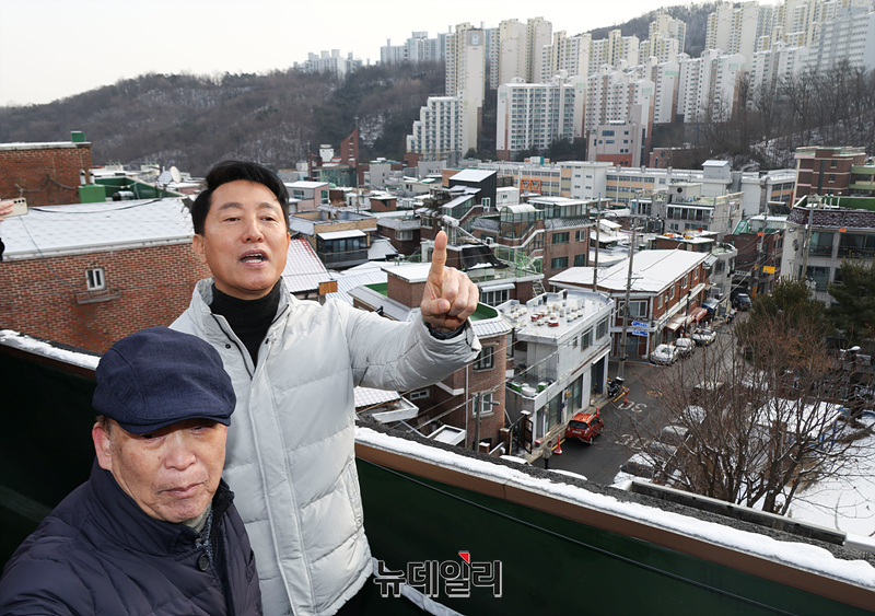 오세훈 서울시장이 19일 오전 서울 관악구 신림7구역 재개발사업 대상지를 찾아 현장 점검을 하고 있다.