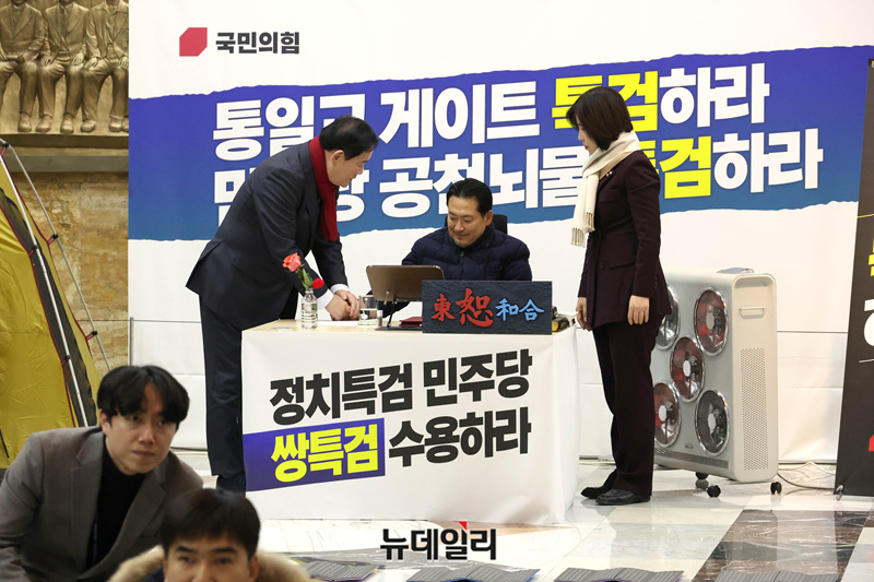통일교의 정치권 로비 의혹, 공천헌금 의혹과 관련한 특검법 수용을 촉구하며 단식 농성하고 있는 장동혁 국민의힘 대표가 19일 국회 로텐더홀 농성장을 찾은 최경환 전 경제부총리와 대화를 나누고 있다.