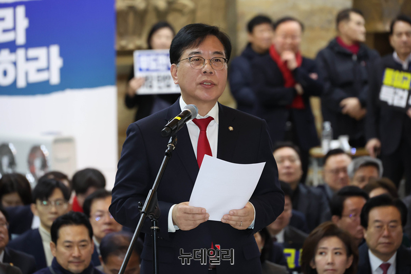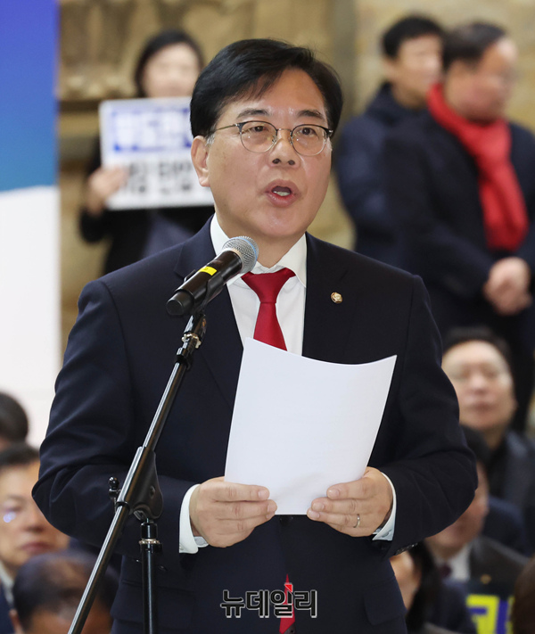 송언석 국민의힘 원내대표가 19일 국회 로텐더홀에서 더불어민주당에 통일교·공천헌금 '쌍특검' 수용을 요구하며 발언을 하고 있다.