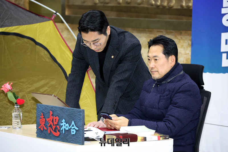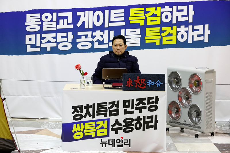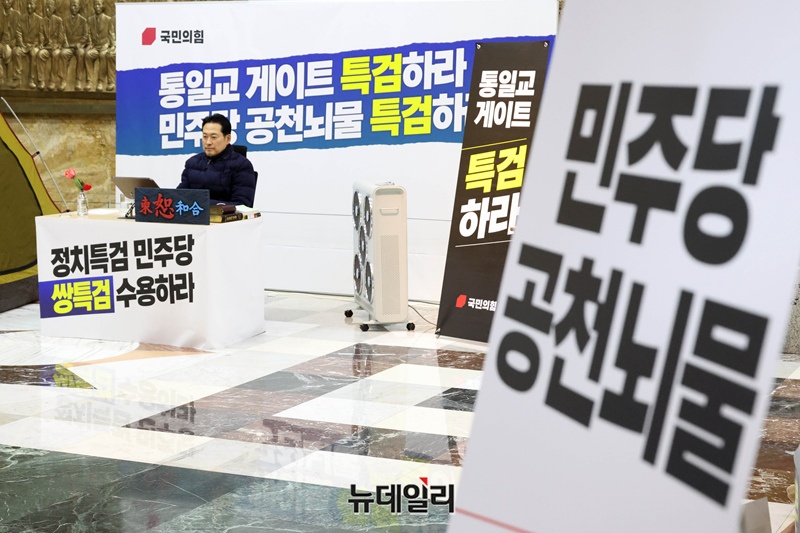 닷새째 단식농성 중인 장동혁 국민의힘 대표가 19일 국회 로텐더홀에 농성장에 앉아 있다.