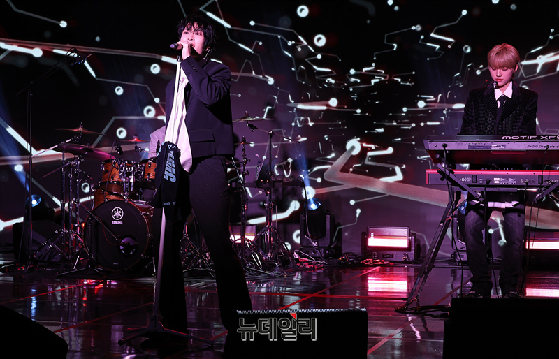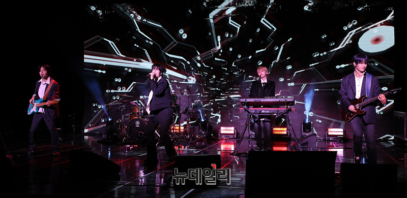밴드 캐치더영(Catch The Young)이 19일 오후 서울 강남구 일지아트홀에서 열린 첫 번째 정규앨범 'EVOLVE(이볼브)' 쇼케이스에서 타이틀곡 무대를 선보이고 있다.타이틀곡 'Amplify(엠플리파이)'는 캐치더영이 데뷔곡 'YOUTH!!!(유스!!!)'에서 확립한 YOUTH POP-ROCK(유스 팝-록) 정체성을 기반으로 한 2026년형 뉴웨이브 록 장르의 트랙이다.'EVOLVE'는 YOUTH POP ROCK(유스-팝 록)을 기반으로 캐치더영이 그간 축적해 온 음악적 경험과 정체성을 집약한 앨범. 총14트랙을 담았다.