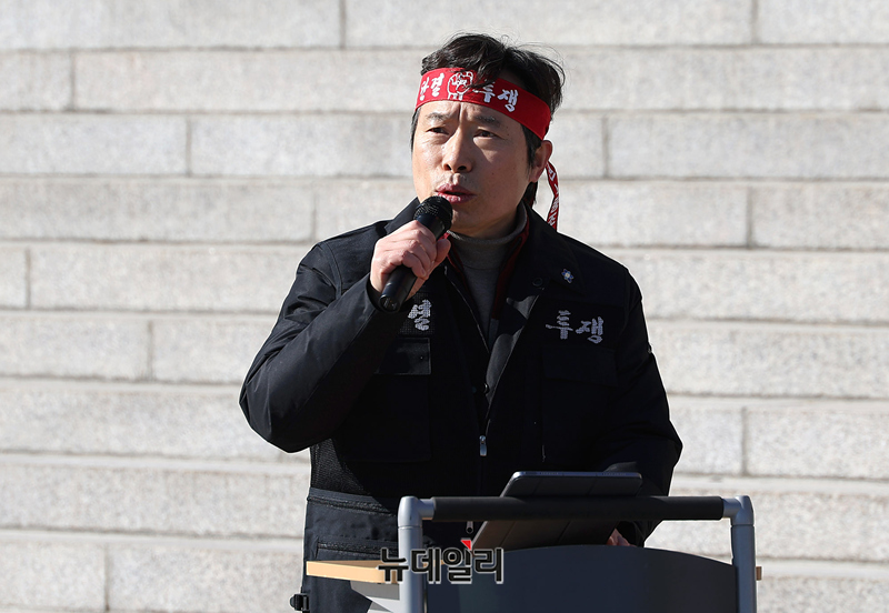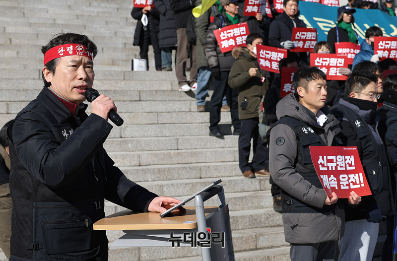 강창호 한국수력원자력노동조합 위원장이 20일 오후 국회의사당 본관 중앙계단에서 열린 '원자력 지키기 및 전휘수 사장 후보 반대 결의대회'에서 발언하고 있다.한수원노조는 이날 결의대회를 통해 한수원 차기 사장 인선 과정에서 “탈원전 정책과 월성1호기 조기폐쇄 논란과 연관된 인사가 핵심 기관의 수장을 맡아서는 안 된다”는 입장을 밝혔다.노조는 AI·데이터센터 확산에 따른 전력 수요 급증에 대응하기 위해 신규 원전 건설과 월성2·3·4호기 계속운전이 필수 과제라고 강조하며 한수원 사장은 산업·기술·현장에 대한 전문성과 함께 ‘원전 경쟁력 강화’에 대한 확고한 비전이 요구된다고 밝혔다.