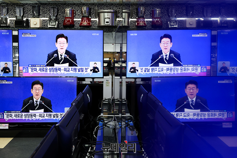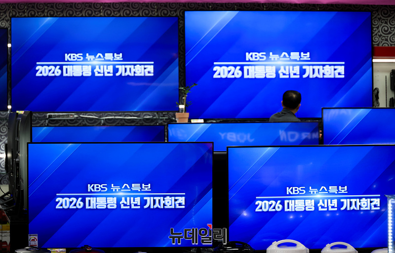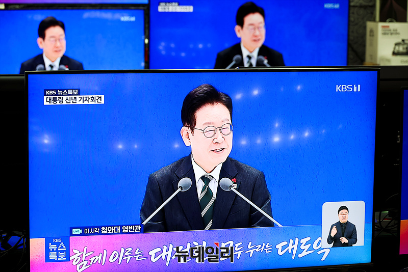 이재명 대통령 집권 2년차를 맞아 진행된 신년 기자회견이 21일 오전 서울 용산구 전자랜드 한 매장에서 송출되고 있다.