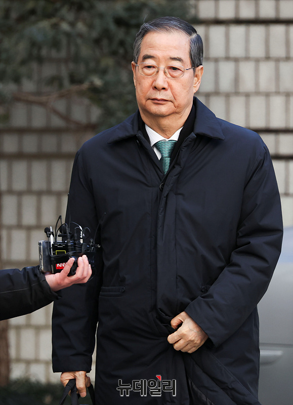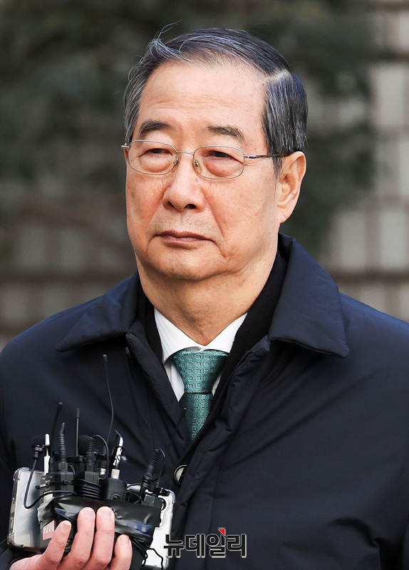 내란 우두머리 방조 혐의를 받는 한덕수 전 국무총리가 21일 오후 서울 서초구 서울중앙지법에서 열린 1심 선고 공판에 출석하고 있다.