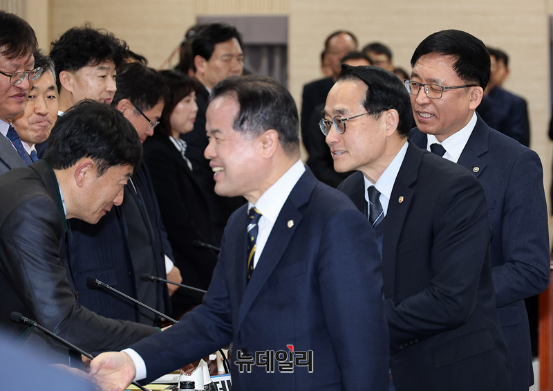 허철훈 중앙선거관리위원회 사무총장, 위철환 상임위원, 강동완 사무차장이 21일 오후 경기 과천시 중앙선관위 과천청사에서 6월 3일 제9회 전국동시지방선거를 앞두고 열린 2026년도 주요업무계획 회의 및 청렴실천 서약식에 입장하며 악수를 나누고 있다.