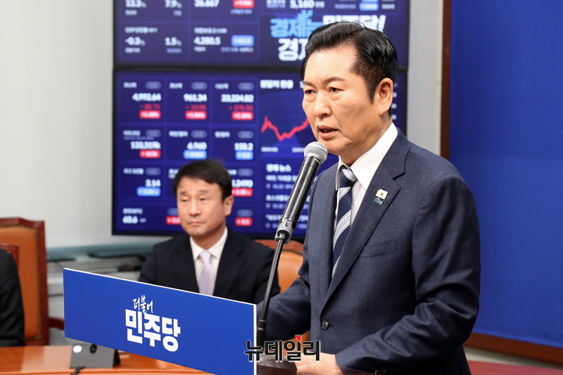 정청래 더불어민주당 대표가 22일 오전 국회에서 긴급 기자회견을 갖고 조국혁신당과의 합당을 제안하고 있다.
