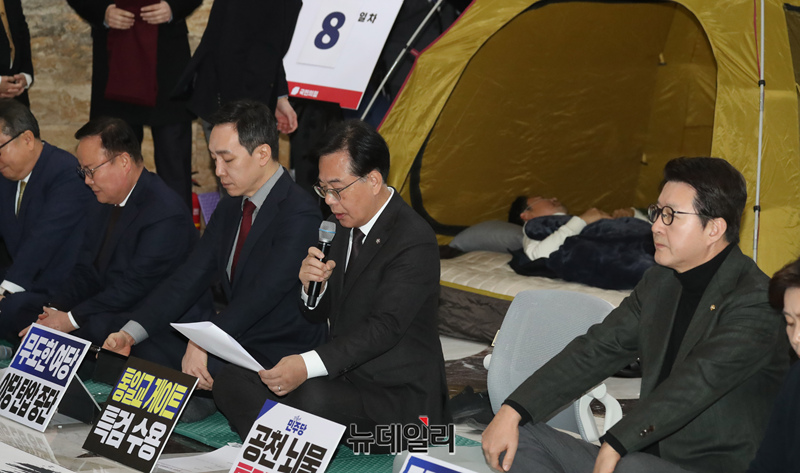 통일교 및 공천헌금 특검 수용을 촉구하며 8일째 단식을 하고 있는 장동혁 국민의힘 대표가 22일 국회 로텐더홀 농성장에 마련된 텐트 안에 누워 있다.
