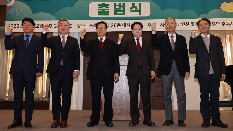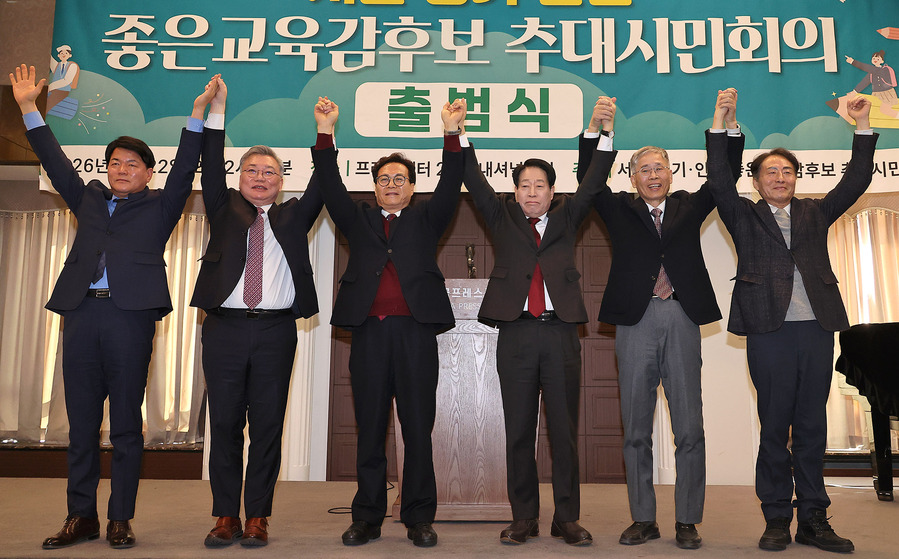 연규원 강남영상미디어고 교사(왼쪽부터), 이현준 넥스트인천교육 상임대표, 이대형 전 인천교원단체연합회장, 류수노 전 방송통신대학교 총장, 신평 변호사, 임해규 전 두원공대 총장 등 예비후보들이 22일 오후 서울 중구 한국프레스센터에서 열린 서울경기인천 좋은교육감후보 추대시민회의 출범식에서 기념촬영을 하고 있다.