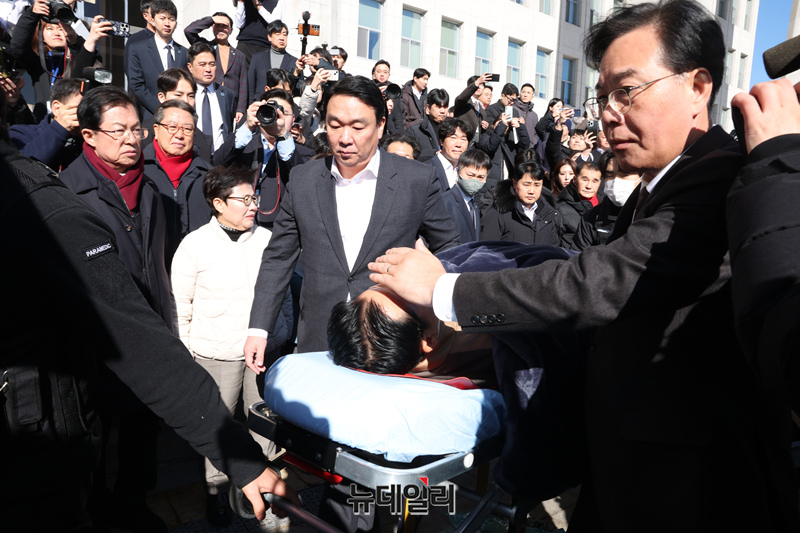 통일교·민주당 공천 뇌물 특검을 요구하며 8일째 단식을 이어가던 장동혁 국민의힘 대표가 22일 오후 국회에서 병원으로 이송되고 있다.