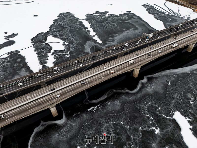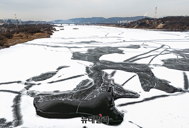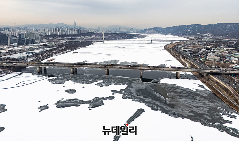 강추위가 이어지는 26일 오전 경기 구리시에서 드론으로 본 한강이 꽁꽁 얼어있다.