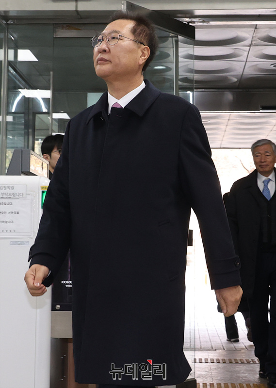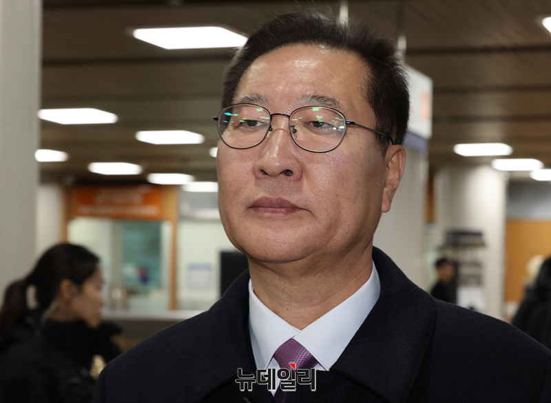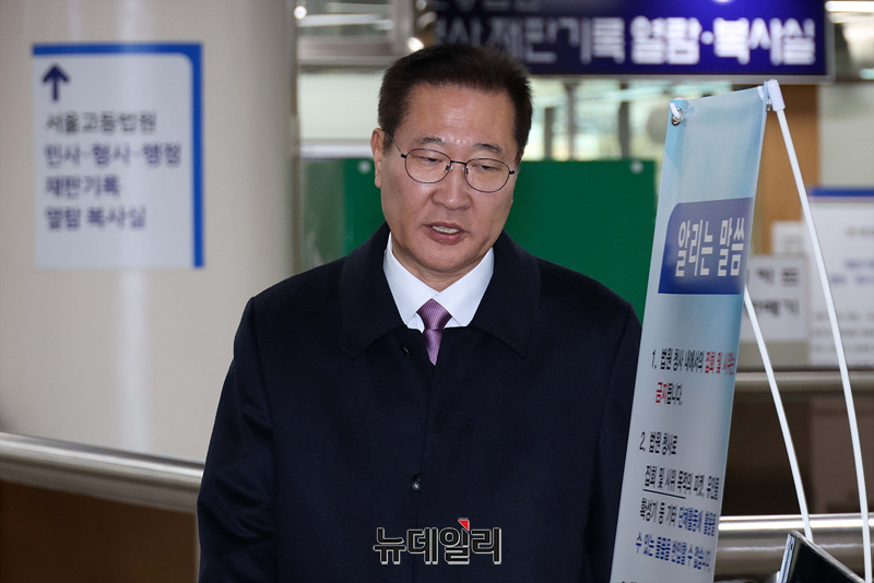 박성재 전 법무부 장관이 26일 서울 서초구 서울중앙지법에서 열린 내란 중요임무 종사 및 직권남용, 부정청탁금지법 위반 혐의 사건의 첫 공판 기일에 출석하고 있다.