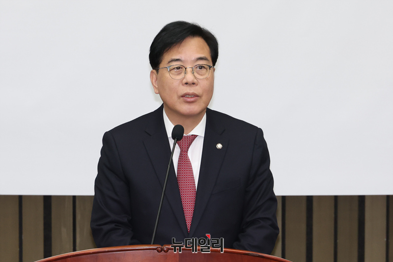 송언석 국민의힘 원내대표가 26일 국회에서 열린 의원총회에서 발언하고 있다.
