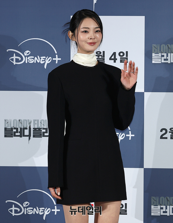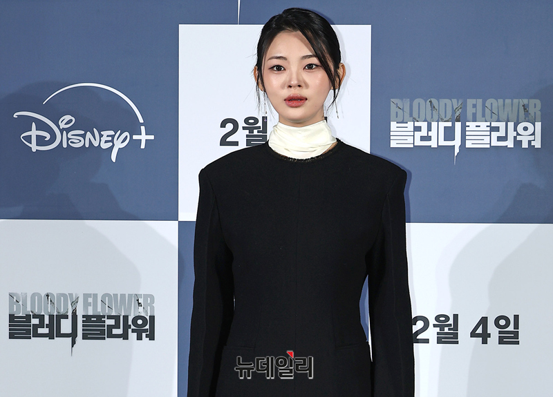 배우 정소리가 27일 오전 서울 CGV 용산아이파크몰에서 열린 디즈니+ '블러디 플라워(연출 한윤선)' 제작발표회에서 포즈를 취하고 있다.