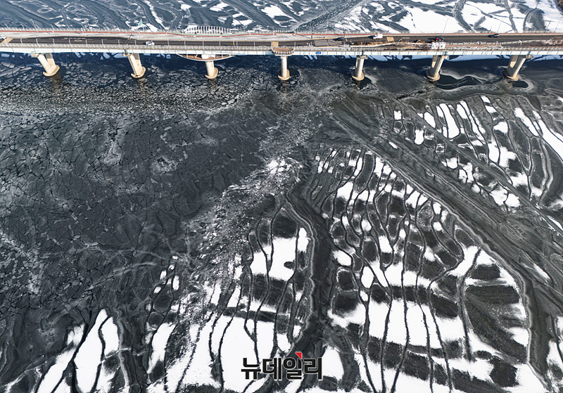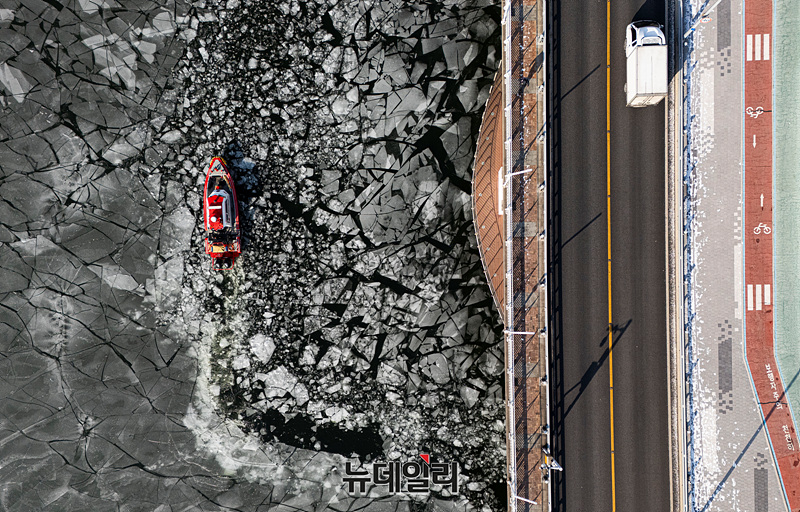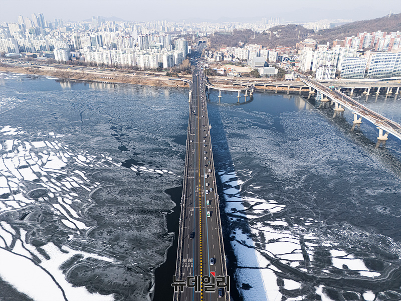 한파가 연일 이어지는 27일 오전 서울 광진구에서 본 한강에 얼음이 떠 있다.