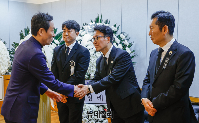 이해찬 민주평화통일자문회의 수석부의장의 빈소가 27일 서울 종로구 서울대학교병원 장례식장에 마련된 가운데 우상호 전 정무수석이 조문을 하고 있다. (사진=공동취재단)