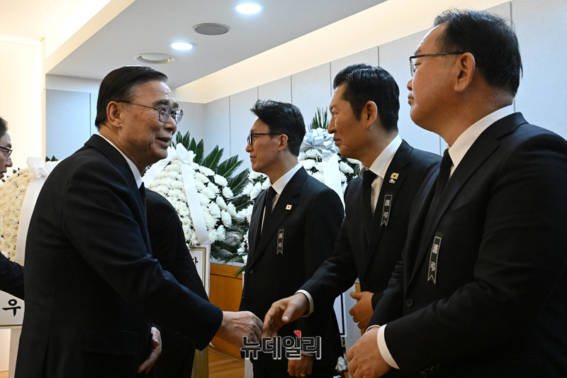 이종석 국정원장이 27일 서울 종로구 서울대학교병원 장례식장에 마련된 이해찬 민주평화통일자문회의 수석부의장의 빈소에서 정청래 더불어민주당 당대표와 인사하고 있다. 2026.1.27 사진공동취재단