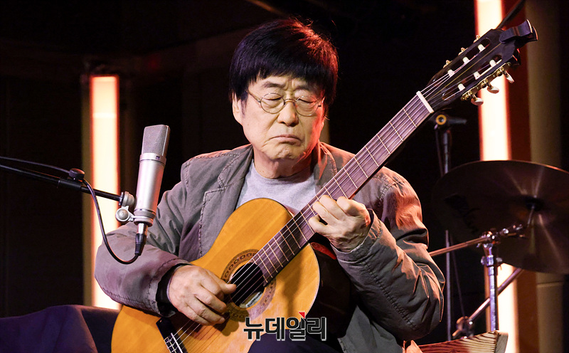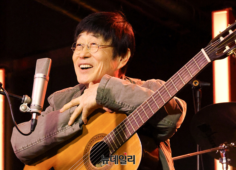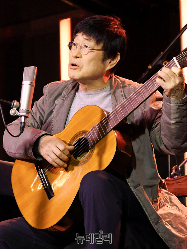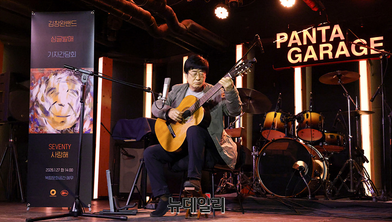 가수 김창완이 27일 오후 서울 종로구 복합문화공간 에무에서 열린 김창완 밴드 싱글 '세븐티(Seventy)' 발매 기념 기자간담회에서 무대를 선보이고 있다.