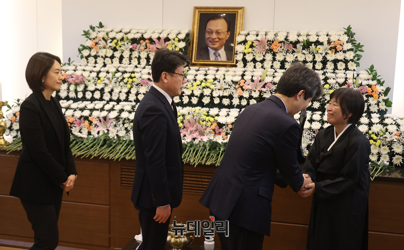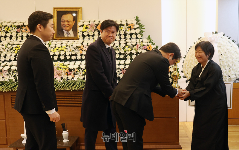 이인영 더불어민주당 의원 등 소속당 의원들이 27일 오후 서울 종로구 서울대학교병원 장례식장에 마련된 고 이해찬 민주평화통일자문회의 수석부의장의 빈소를 찾아 조문하며 정청래 더불어민주당 대표를 위로하고 있다. 2026.1.27 사진공동취재단
