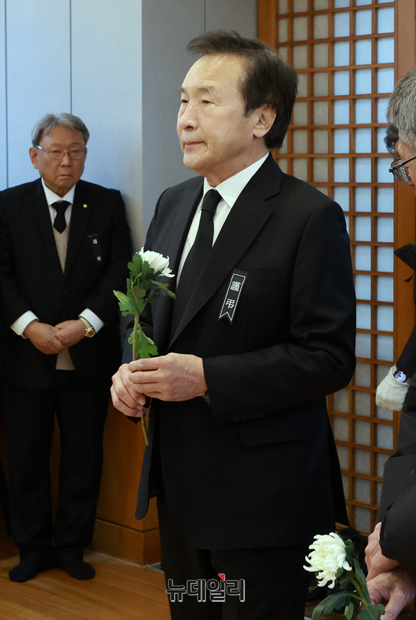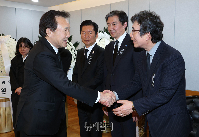 손학규 전 바른미래당 대표가 27일 서울 종로구 서울대학교병원 장례식장에 마련된 이해찬 민주평화통일자문회의 수석부의장의 빈소를 찾아 유시민 전 노무현재단 이사장과 인사하고 있다. 2026.1.27 사진공동취재단