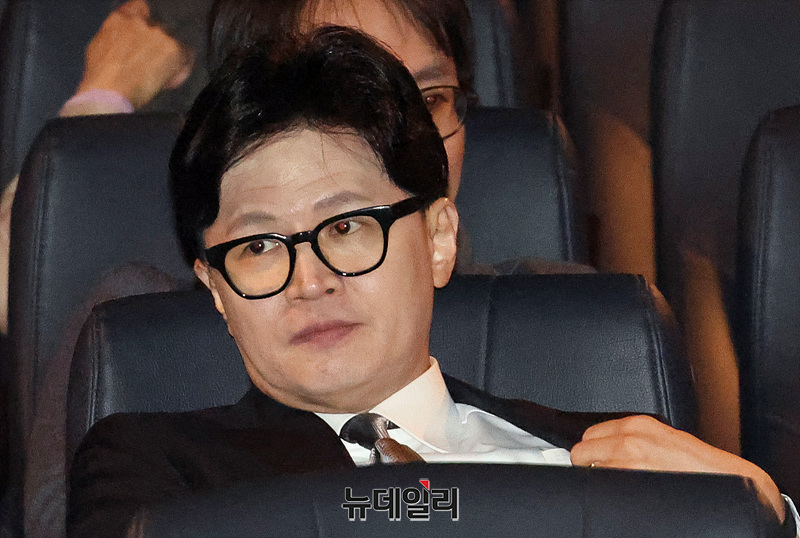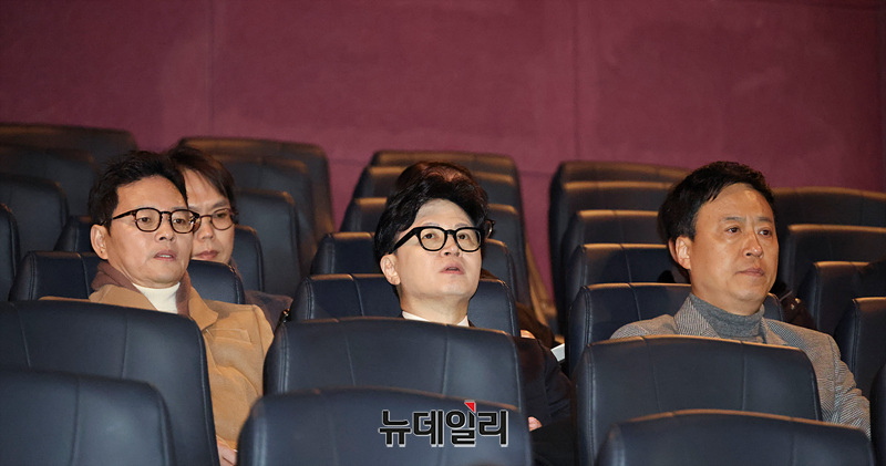 한동훈 전 국민의힘 대표와 의원들이 28일 오전 서울 영등포구 한 영화관에서 '잊혀진 대통령 : 김영삼의 개혁시대'를 관람하기 자리하고 있다.