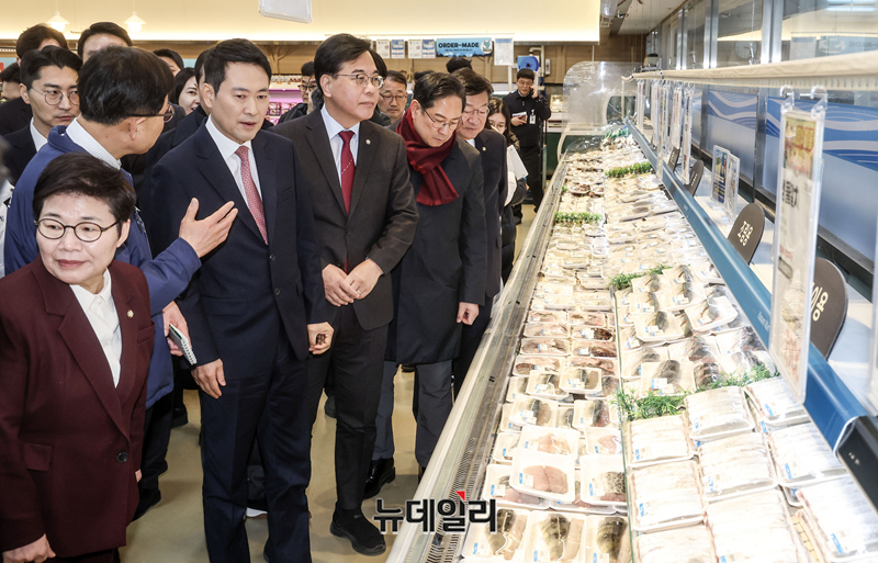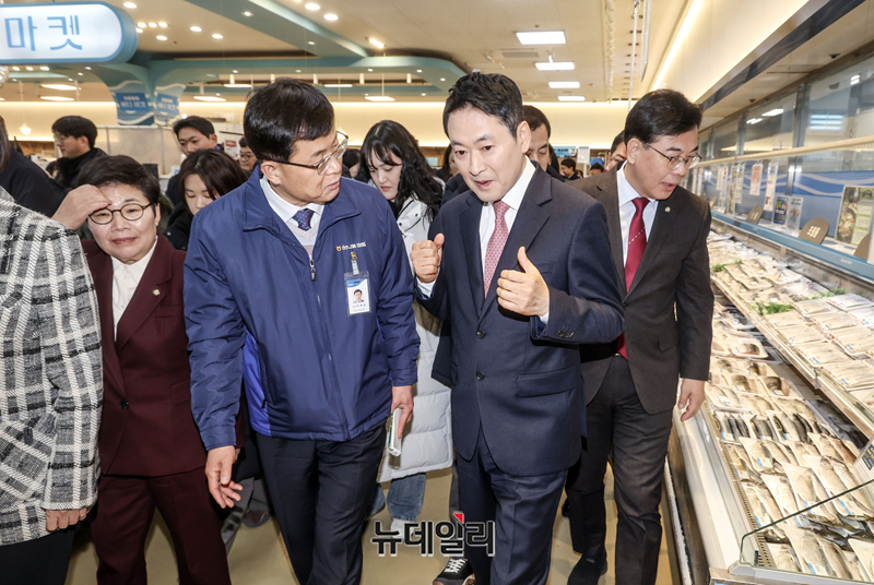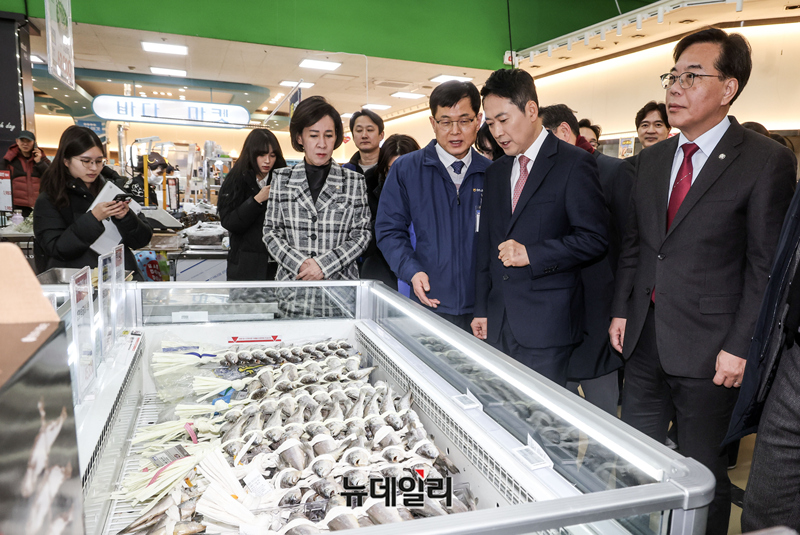 설 명절 맞이 물가점검 현장방문에 나선 장동혁 국민의힘 대표가 28일 오후 서울 서초구 하나로마트 양재점 수산물 코너에서 관계자의 설명을 들으며 이동하고 있다.