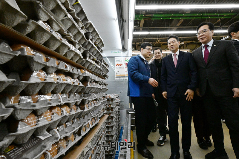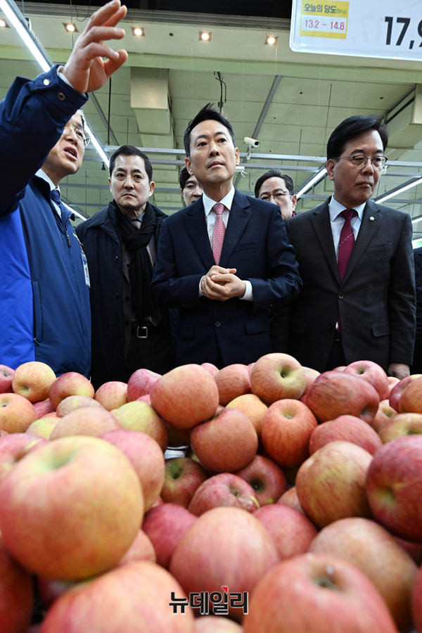 장동혁 국민의힘 대표와 송언석 원내대표 등이 28일 서울 서초구 하나로마트 양재점을 찾아 박혜성 지사장의 설명을 들으며 물가점검 현장방문을 하고 있다.