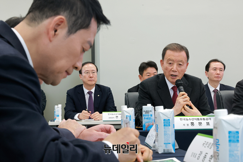 국민의힘 장동혁 대표(오른쪽)가 28일 서울 서초구 한국농수산식품유통공사(aT) 종합상황실에서 열린 물가 점검 현장간담회에 참석하며 홍문표 aT 사장과 인사하고 있다.