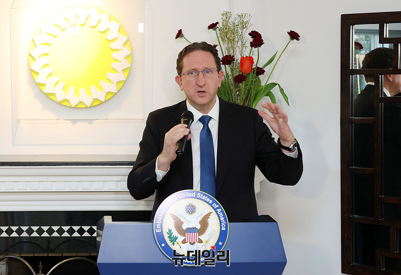 제임스 헬러 주한 미국대사대리가 28일 오후 서울 성북구 성북동 관저에서 열린 미국 건국 250주년 기념 '표현의 자유: Freedom 250 한미 창의 대화' 전시 행사에서 축사를 하고 있다. (사진=공동취재단)
