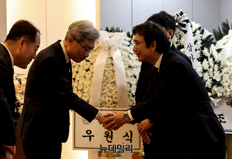 김상환 헌법재판소장이 29일 오후 서울 종로구 서울대학교병원 장례식장에 마련된 故 이해찬 전 국무총리의 빈소에서 인사를 나누고 있다. (사진=공동취재단)
