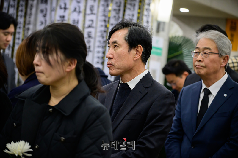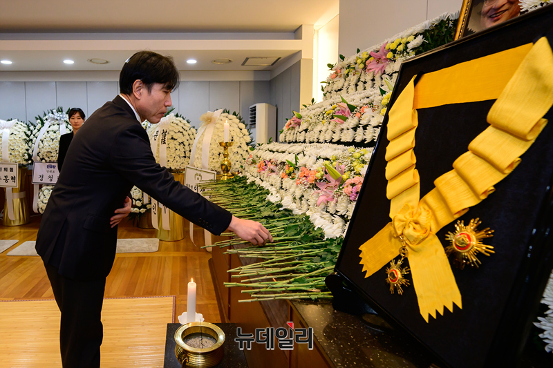 30일 오후 서울 종로구 서울대학교병원 장례식장에 마련된 고 이해찬 전 국무총리의 빈소에서 하태경 보험연수원장이 조문을 하고 있다. 2026.01.30 사진공동취재단