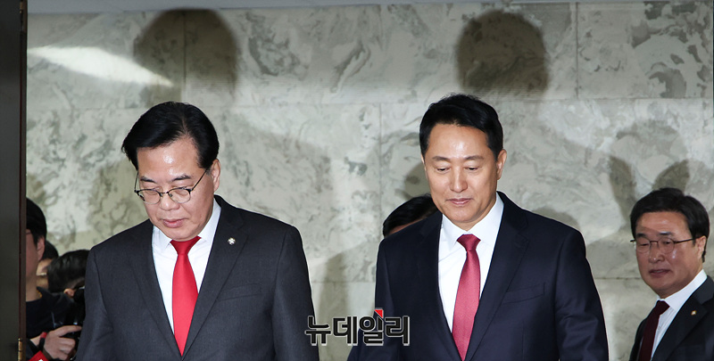 송언석 국민의힘 원내대표와 오세훈 서울시장이 2일 오전 서울 여의도 국회에서 열린 국민의힘-서울특별시 부동산정책협의회에 참석하고 있다.
