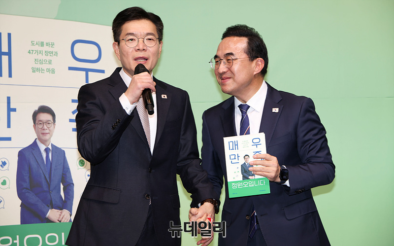 정원오 성동구청장이 2일 오후 서울 성동구 디노체컨벤션웨딩홀에서 열린 출판기념회 '매우만족, 정원오 입니다'에서 박홍근 더불어민주당 의원의 손을 잡고 발언하고 있다.