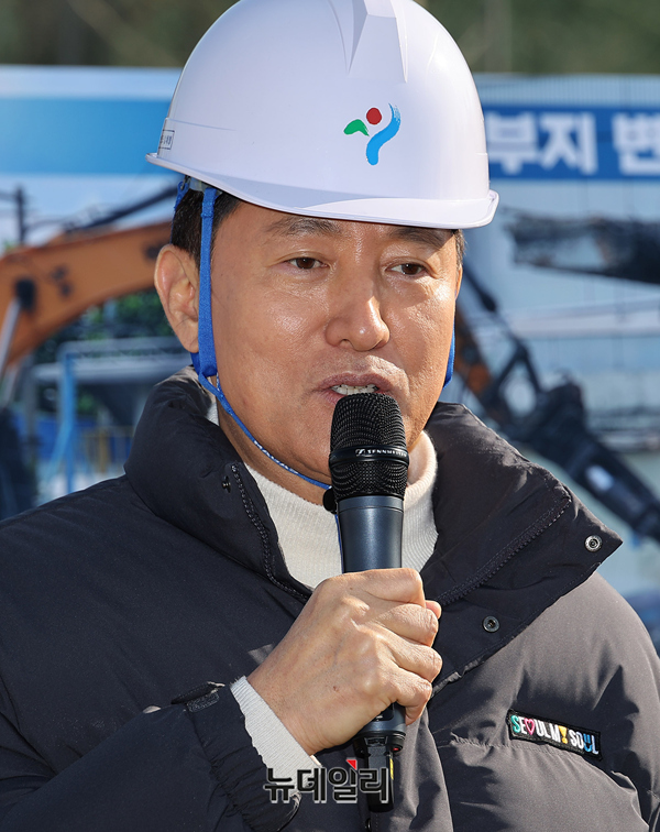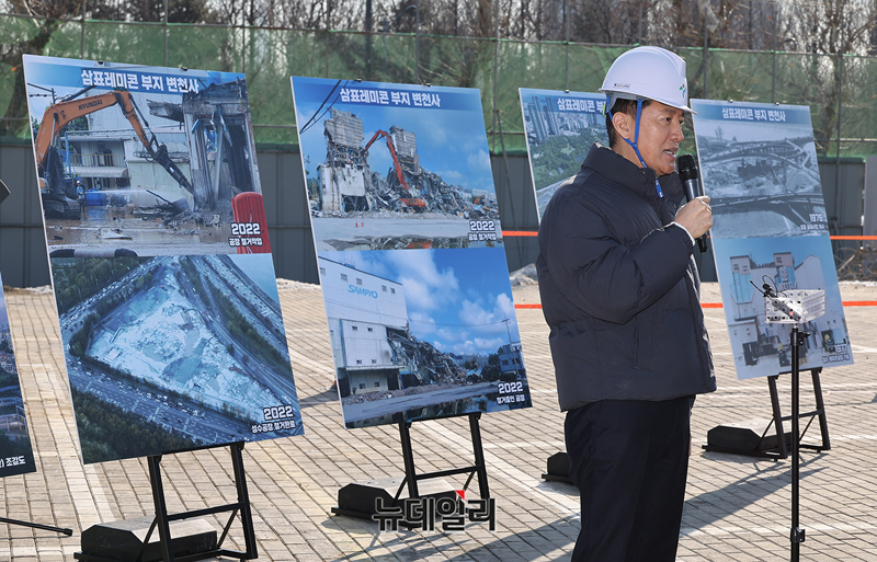 오세훈 서울시장이 3일 오전 서울 성동구 성수동 삼표레미콘 부지를 방문해 토양점검 및 현장점검을 마치고 발언하고 있다.
