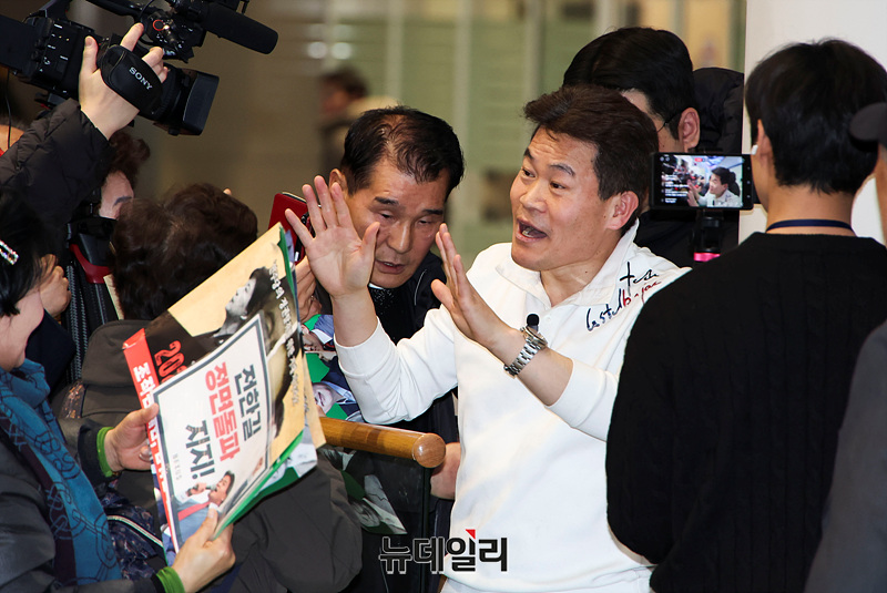 전한길 전 한국사 강사가 3일 오후 인천국제공항 제2여객터미널을 통해 귀국하며 인사를 나누고 있다.