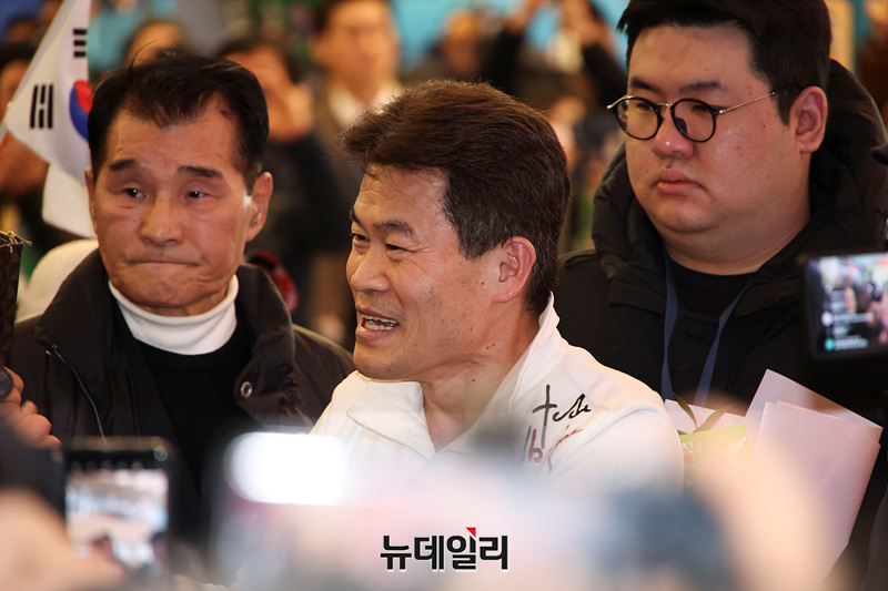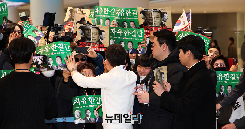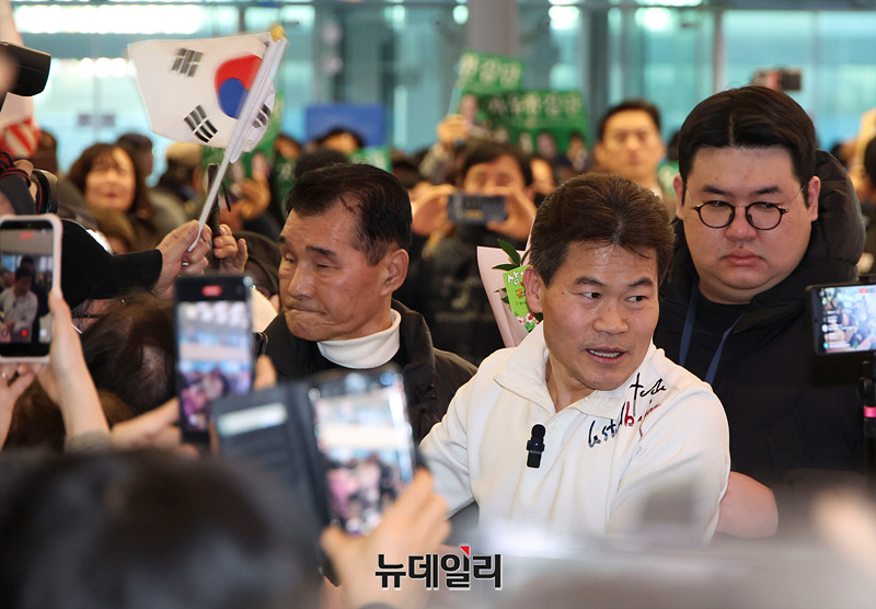 인천공항에 대거 몰린 지지자들은 애국가를 부려며 전한길 전 강사를 맞았다. (인천=서성진 기자)