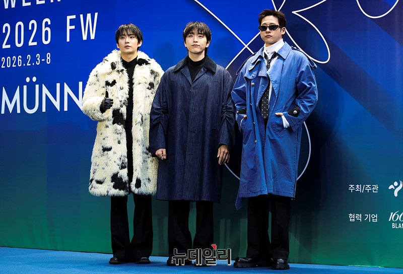그룹 b1a4 신우, 산들, 공찬이 3일 오후 서울 중구 동대문디자인플라자에서 열린 '서울패션위크 2026 FW' 포토월에서 포즈를 취하고 있다.
