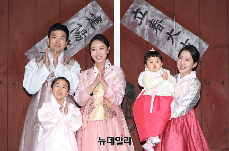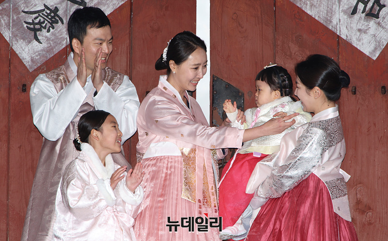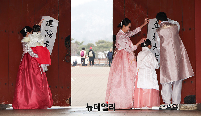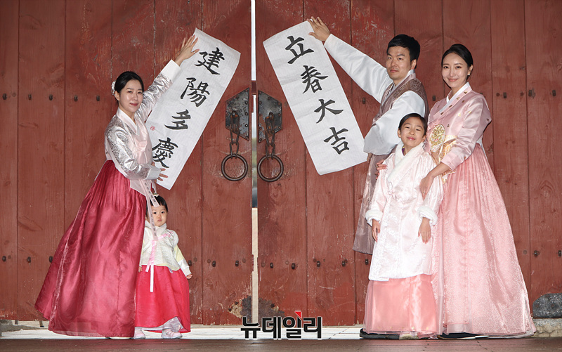 절기상 입춘(立春)인 4일 오전 서울 중구 남산골한옥마을에서 말띠 시연자 가족이 입춘첩을 부착하고 있다.