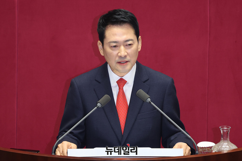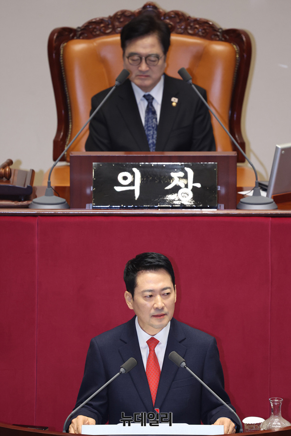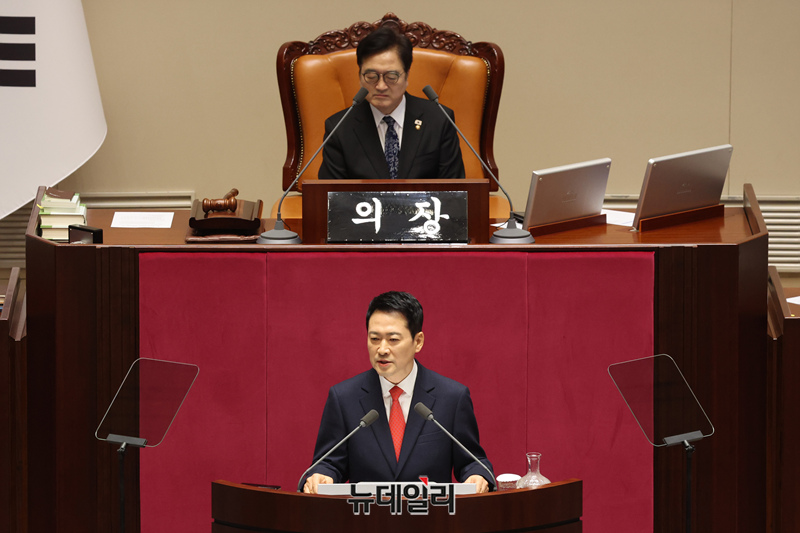장동혁 국민의힘 대표가 4일 오전 국회에서 열린 본회의에서 교섭단체 대표 연설을 하고 있다.