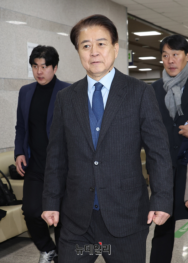 불법 정치자금 수수 혐의로 기소된 노웅래 전 민주당 의원이 4일 오후 서울 서초구 서울중앙지법에서 열린 항소심 1차 공판에 출석하고 있다.